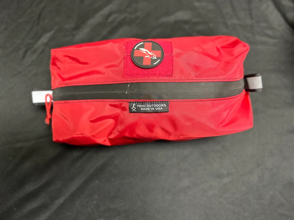 Using weatherproof and hi-visibility materials in a bag custom made by Fehu Outdoors, this kit comes in just under 3lbs. It is designed to be lashed to a pack, attached to a pack with velcro inside, or mounted to the headrest of a vehicle with the included mounting kit.