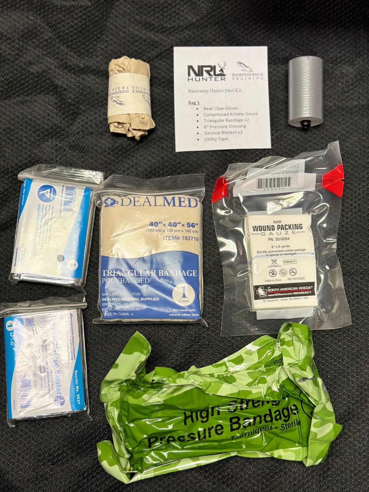 Nested just inside the zipper is a Lightweight Hunter Med Kit, immediately available for either life-threatening emergencies or to be carried separately in a daypack. The additional two vacuum-sealed bags and the loosely packed universal splint are there for further wound stabilization, dealing with common injuries, and for handling smaller wounds. Our Hunter kits also have extra space for your own additions and personal needs.