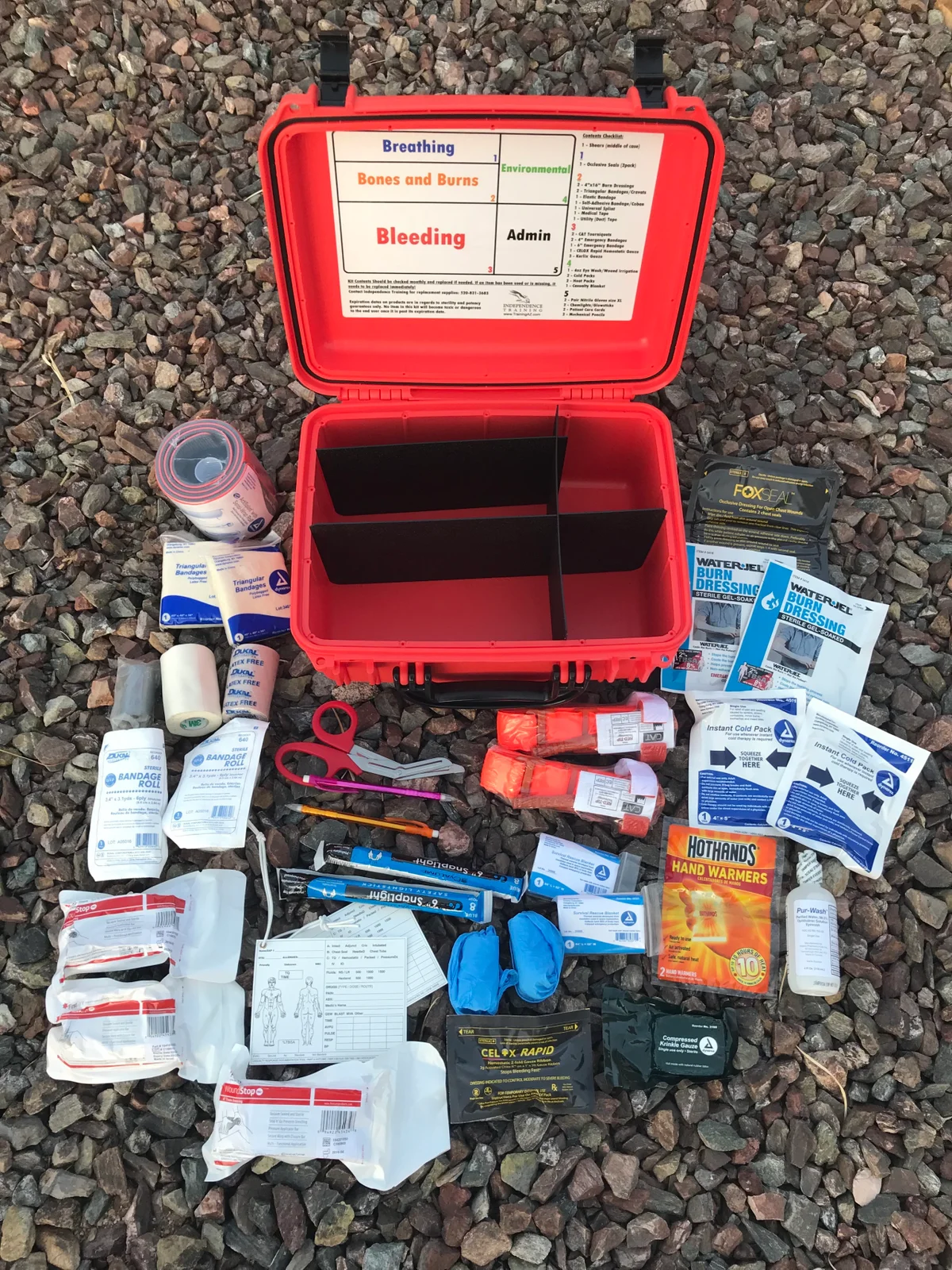 Trauma Shears- Occlusive Chest Seals- Burn Dressings- Elastic Bandages- Cravats- Universal Splint- Medical Tape- Utility Tape- CAT TQ- Pressure Bandages- Hemostatic Blood Clotting Gauze- Compressed Gauze- Saline Wash- Cold Packs- Heat Packs- Emergency Blanket- Nitrile Gloves- Chemlights- Patient Care Cards